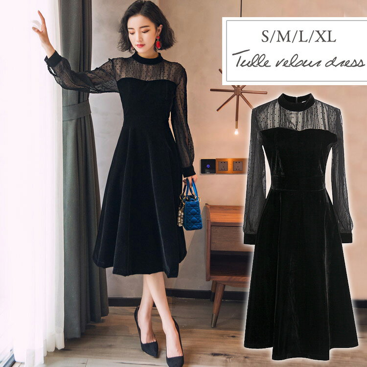 ベロアワンピース レディース ドット チュール シースルー 袖 秋 冬 秋服 膝丈 ひざ丈 膝下 袖あり 長袖 ミディアムドレス 大人 上品 フォーマル 大きいサイズ